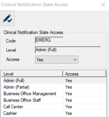 Clinical Notification State Access Window(Maintenance > Scheduler > Clinical Notification States ) The Clinical Notification State Access window allows you to manage access to the selected clinical notification state. It displays when you open the Clinical Notification States window, select a listed state and click the Level Access (