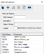 Wait List Reasons WindowIf a patient cannot get an appointment on the day they need/want, you can place them on a wait list. A wait list contains a series of patients that would prefer an earlier appointment than the one they currently have booked. When an appointment is cancelled, a scheduling clerk can fill the open space from the wait list. Wait list reasons help order and prioritize the wait list. Priority is used to indicate the urgency of the request. If a wait listed patient has an urgent need, they are prioritized ahead of someone merely inconvenienced by their appointment’s date. Depending on the reason, a patient may be removed from the wait list once the date is close to their actual appointment date. Example: A patient scheduled for a screening appointment booked three months prior is unlikely to rearrange their schedule to come in four days earlier. However, a patient who is in pain can often come in on very short notice and will gladly come in even one day earlier. The Wait List Reasons window allows you to manage the list of wait list reasons and indicate the priority of the reason.