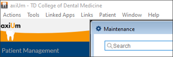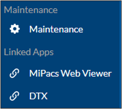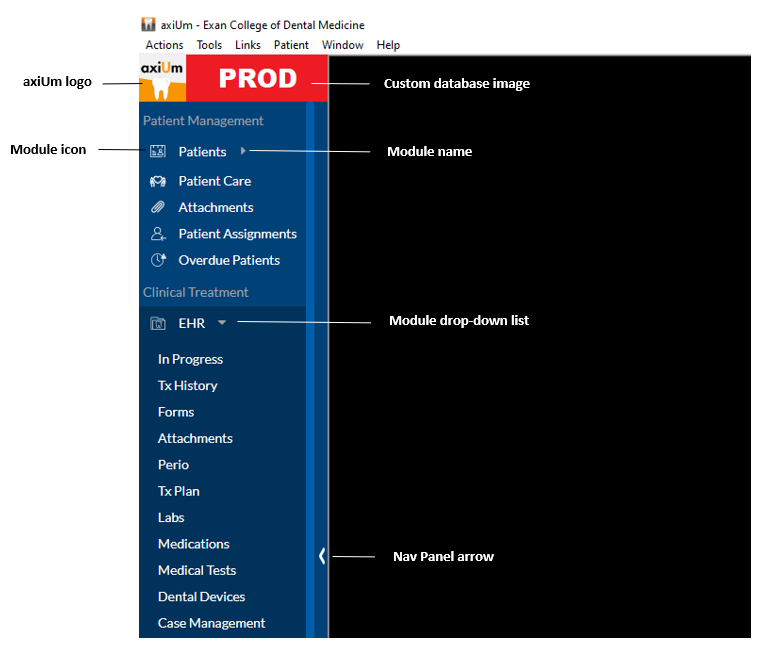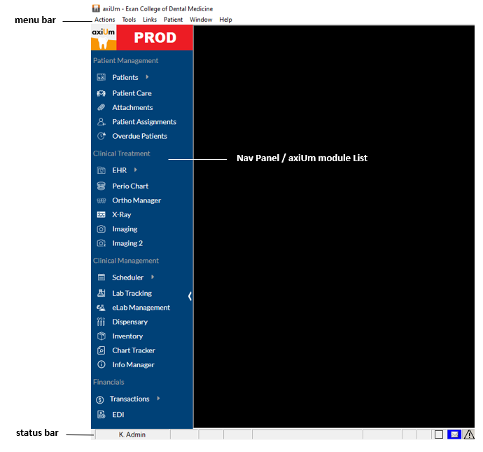 The Nav Panel displays on the left side of axiUm. It lists all available modules. Certain modules may also have sub-menus that open specific areas in the module. Important: The number of displayed modules depends on your security level. Tip: If needed, you can click the ( If present, a customized DB image displays next to the axiUm logo. Note: When minimized, only the axiUm logo displays. At the bottom of the Nav Panel, a Linked Apps section may display a list of software applications that have been integrated with axiUm. If configured, you can select a linked app to launch the configured URL or command line application and automatically pass information from axiUm to the app. Example: MiPACS Web Viewer The menu bar displays along the top of axiUm. Each menu contains a set of options. It offers another method to open modules and use tools. It also lists patients and allows you to open Help. The status bar displays along the bottom of axiUm and includes the logged in user, the selected patient, and a variety of indicators that convey additional information.