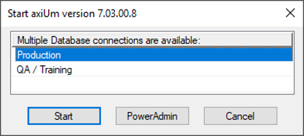 The axiUm desktop displays when you first launch axiUm. To access the axiUm desktop, you must select the database (if applicable) and authenticate yourself in the system. Note: If the axiUm LiveUpdater is configured on your machine and a patch is available when you launch axiUm, the axiUm LiveUpdater process may run before you can log in. If you have access to multiple axiUm databases on your workstation, you can select which database to connect to. Example: You have access to both Production and Training databases. To select the database: