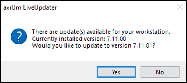 When the update is complete, axiUm opens and you can log in. Note: For workstation instances that do not use axiUm LiveUpdater, the previous update methods such as manually copying files or using the auto-update folder can still be used. You must authenticate your credentials to open and access axiUm.
