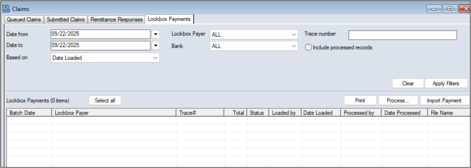 Notes: The Lockbox module is accessed through the Claims module > Lockbox Payments tab. You can open the Lockbox module using one of the following methods: