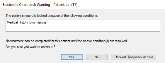 Note: Temporary access is usually granted so that you may resolve the locked condition. It must be requested by the user, then approved by an authorized user. If a patient record is chart locked, you may see one of two windows when you attempt to select the patient: