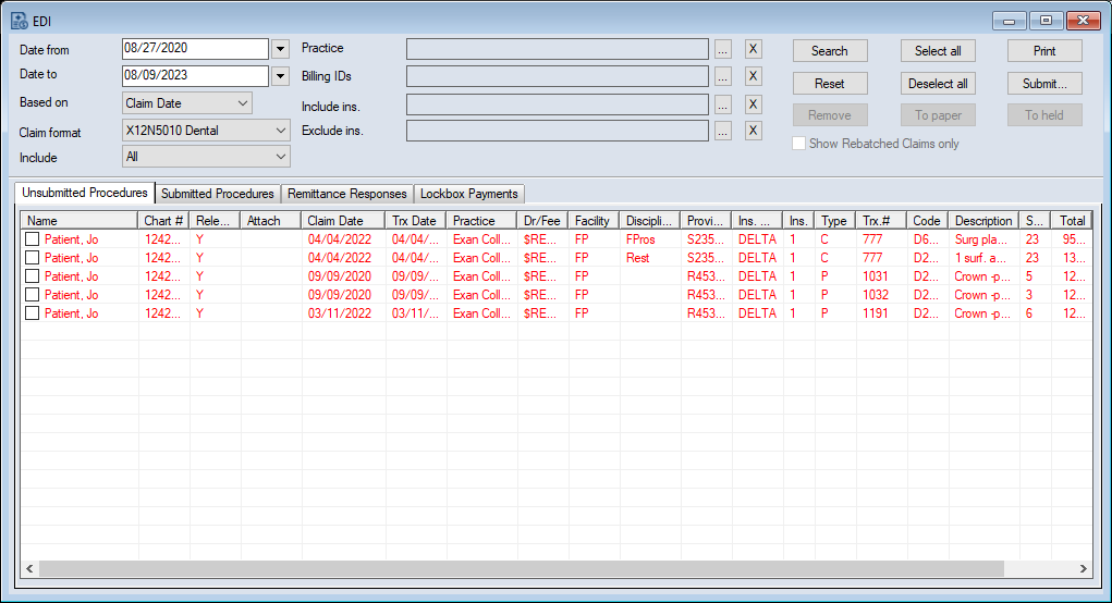 The EDI (Electronic Data Interchange) module is comprised of one core axiUm module and several optional axiUm+ modules. Each component allows you to complete important financial tasks for your dental institution. EDI Claims is a core axiUm module that allows you to easily monitor patient procedures and submit insurance claims electronically. When accessed, the EDI window allows you to complete a variety of actions, including printing, submitting, or batching claims for processing later. You can also correct any errors that prevent a claim from being processed. You can directly open the EDI Claims module using one of the following methods:
