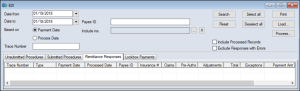 Within the Remittance Responses tab, search fields and action buttons display in the upper pane, and remittance payment search results display in the in the lower pane. From this area, you can search for, load, and process EDI remittance files.