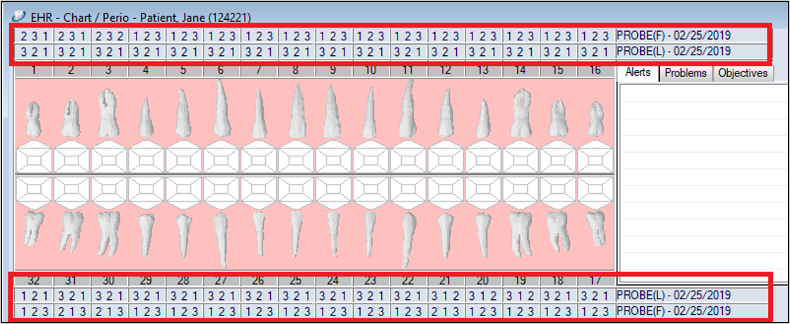 The Perio Chart module (or simply Perio module) is used to record the state of a patient’s periodontal health by charting conditions like pocket depths, attachments, and bleeding. The module displays the information graphically or with text, enabling users to compare data over time as they determine an appropriate course of treatment. The EHR module allows you to view and access most of this information from within the odontogram and the Perio tab. There are two places in the EHR that allow you to view and access most perio information: