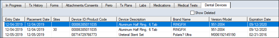 Click the Dental Devices tab and review the listed entries.