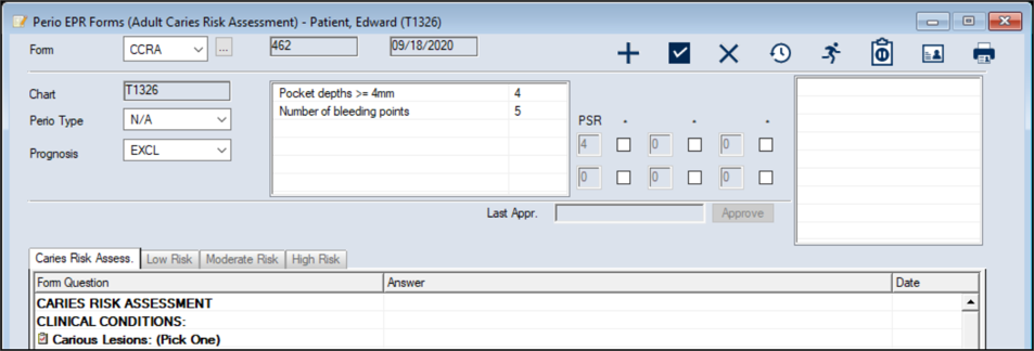 Note: If the patient does not have any perio exams on file yet, the fields are completely blank. When necessary, you can edit saved, incomplete exams. Important: Once an exam is completed and approved by a faculty member or instructor, it cannot be edited. Note: If the entry is a multi-instance form with multiple instances on file, the Select Form window displays, prompting you to select the correct instance. Forms may be single- or multi-instance forms. If a multi-instance perio form is in use on the patient record, you may sometimes need to display a different instance of the form than is already selected. Note: This icon does not display if a single instance form is selected In extreme circumstances, it is possible to delete a perio form. Important: We do not recommend deleting perio forms. Note: If the entry is a multi-instance form with multiple instances on file, the Select Form window displays, prompting you to select the correct instance. Note: If the entry is a multi-instance form with multiple instances on file, the Select Form window displays, prompting you to select the correct instance. Note: The standard Perio Form report uses the PtForm.rpt file. You can view the patient’s current perio status, listed conditions, and current PSR scores at the top of the Perio EPR Forms window. When necessary, you can modify the information to keep it current with the patient’s progress. Note: Depending on your setup and institution’s requirements, axiUm may calculate the patient’s PSR scores automatically or you may need to enter scores manually. Each PSR score box represents an intraoral sextant. Intraoral sextants are designated S1-S6 beginning in the maxillary upper right sextant (S1), proceeding in a clockwise manner, and finishing in the mandibular lower right sextant (S6). Note: This field only displays if the form is configured to trigger ASA values at the page level. Note: Any changes are saved automatically.