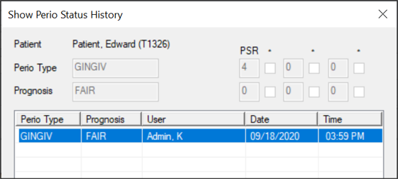 The Perio EPR Forms window allows you to add and manage perio forms for the selected patient, and track perio information, such as current Perio Type, Prognosis, and Perio Screening and Recording (PSR) scores. The patient’s medical alerts, if any are on record, also display. PSR scores are used as a diagnostic tool for the early detection of periodontal disease. Each box represents an intraoral sextant. Intraoral sextants are designated S1-S6 beginning in the maxillary upper right sextant (S1), proceeding in a clockwise manner, and finishing in the mandibular lower right sextant (S6). If your institution is set up to auto-calculate PSR scores, they are based on the patient’s most recent incomplete, complete, or closed exam and are calculated on the worst score within a sextant. Example: If pocket depth is charted and there are pocket depths of 3.0 mm and 5.00 mm in the same sextant, the calculation will be based on the 5.0 mm depth. Note: In the EHR module > Perio tab, the PSR scores are based on the selected exam. If your institution is not set up to auto-calculate PSR scores, you will need to enter the PSR score values manually. PSR scores indicate the following: