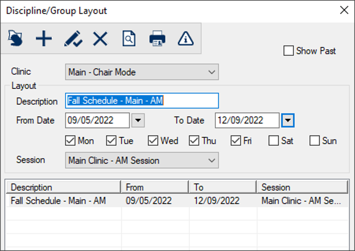 When necessary, you can reassign a provider’s appointments to another provider. Examples: You can reassign an entire day’s schedule to another provider or move all appointments to the other chair. Notes: When necessary, you can indicate if instructor-approved cancellations occurred on a chair reservation. Example: Bad weather prevented most students from attending school that day. Session layouts allow you to specify chair information for a session. They are typically created for sessions that repeat over a range of time. When adding a session layout, you can stamp chairs with instructor, discipline, and provider group information for a session. Note: When working in Availability mode, provider group information cannot be added to the session layout. Tip: If working in Chair or Book mode, you can configure a station option to enforce any stamped provider group settings so that a warning message displays when a user attempts to reserve a chair for a provider not in the group stamped on the chair. This is configured from the Scheduler Options window > Warn if Reserving Chair Assigned to other Provider Group field. If including instructor information in the session layout, this defines the pattern of days that an instructor will work and identifies which clinic chair an instructor will cover during the session. Important: This does not reserve chairs. Example: You can specify the covering instructor for a section of a clinic so students will know who they need to talk to for grading, approvals, start checks, etc. Tip: These are most often used when instructors have regular, predictable schedules. Note: Depending on configuration, an instructor may cover multiple chairs during a session. Instructor information is generally set for undergrad clinics that use Chair or Availability mode. To manage session layouts: Tip: Select the Show Past checkbox to display previous session layouts.