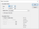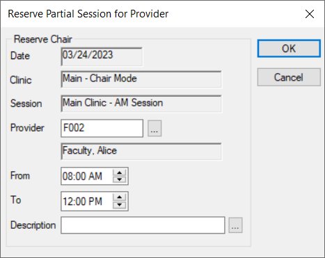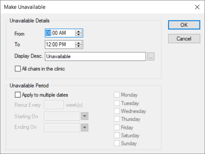 Note: When working in Availability mode, this task is not applicable. Note: This option is only enabled if the Scheduler Options window > Chair Labels section > Enable Partial Reserve on Chair Tab checkbox is selected. Note: When working in Availability mode, this task is not applicable. Some chairs/appointments may require a secondary provider to assist the primary provider. Note: If there are multiple partial reservations in the chair during the session, the provider is added to all. Tip: Chairs reserved with a second provider display an (*). Note: When working in Availability mode, this task is not applicable. Note: Removing the primary provider reservation automatically removes any secondary provider reservation. Note: When working in Availability mode, this task is not applicable. When necessary, you can move a reservation (provider and their patient) to another chair in the current clinic or a different clinic. Note: Reservations can be moved between sessions, but not between different dates. Tip: To cancel a move, right-click the cell and select Cancel. Sometimes you may need to make a chair unavailable for use in a clinic. Example: The chair requires maintenance. In some cases, chairs can be made unavailable because of a recurring reason. Example: The clinic is closed every second Friday for classes. Important: If making a chair unavailable for a range of dates, confirm the dates are correct. Chairs can only be made available again one at a time on each individual date. To make a chair unavailable: