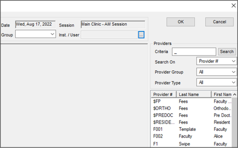 Note: If only allowed a single chair, the provider is removed from the list when assigned to a chair. If removed from the layout, they are re-added to the list, even if they do not match the current search criteria of the list. Note: When working in Availability mode, this step is not applicable. Tip: To clear a cell and remove incorrect stamps except for already saved chair reservations, right-click the cell. Important: To remove a saved provider reservation, it must be unreserved from the chair layout. |