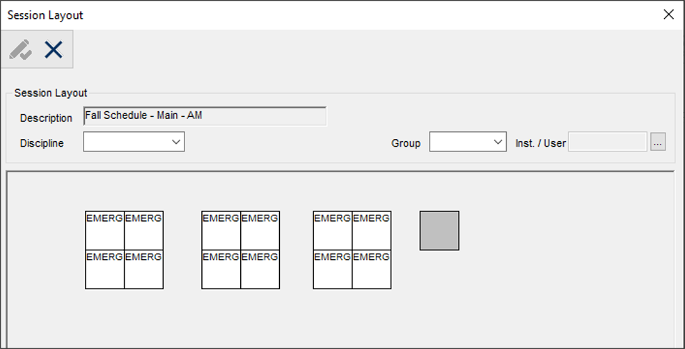 Note: You cannot delete a session layout that is in use. Once the session layout has been created, you can stamp the information onto each chair in the clinic. Note: Gray chairs are unavailable and cannot be stamped.
