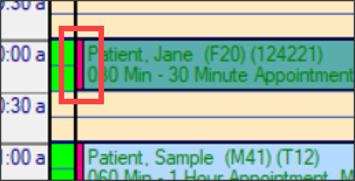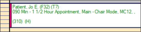 Custom color blocks display according to a scheduled appointment’s background color. Appointment background colors can be configured from the Scheduler Options window > Appt Background Color field. Tip: Appointment blocks can also be customized to display up to five lines of data about a patient appointment. The colored bar to the left of the appointment indicates the provider's schedule color. Provider schedule color is configured from the Maintenance > Office > Users window > Provider tab > Schedule Color field. The colored bar to the left of the provider’s schedule color indicates the different types of provider time: