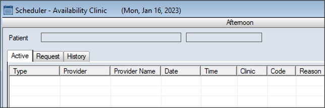 The provider time column is configured from the Scheduler Options window > Show Provider Time Column for Current Provider field. Note: This tab is only applicable for staff responsible for scheduling appointments in Availability mode. When working in Availability mode, the Availability tab allows you to view the selected patient’s active appointments, any appointment requests related to them, as well as their historic record of all appointment activities. You can also access and manage all appointment requests that have been received. From here, they can be scheduled as appointments or sent back to the provider for more information when needed. The Availability tab lists the selected clinic as well as the current session. The Daily Availability area indicates the selected provider’s availability for the selected day. The time blocks may display in different colors: