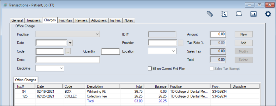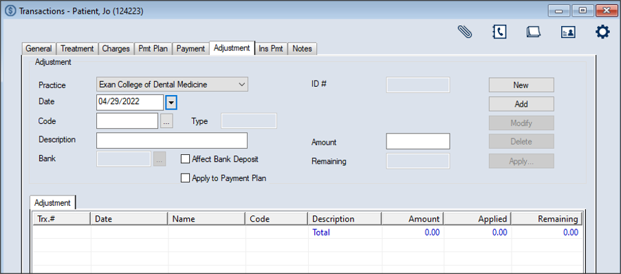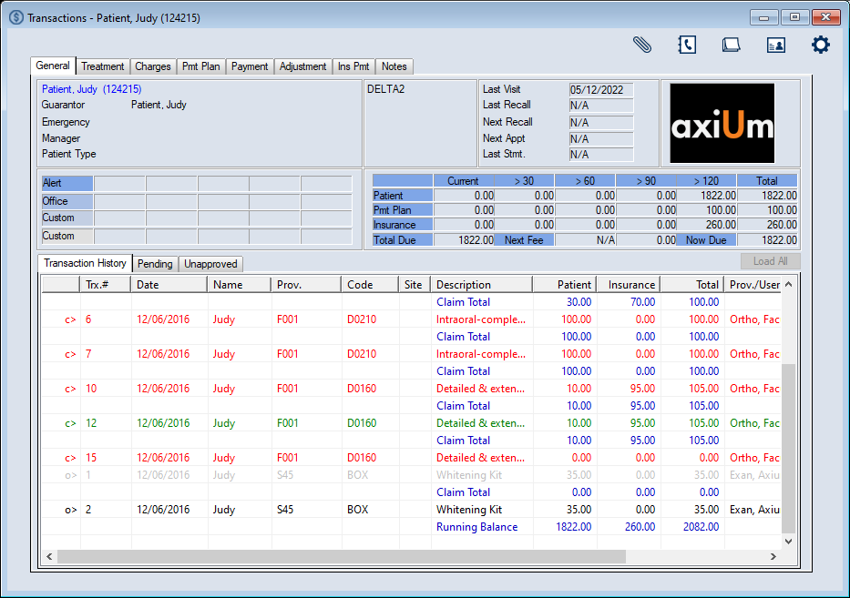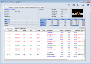 The Transactions module is the financial hub of axiUm. It allows you to view the selected patient’s financial information and account history and all treatments added to the patient record. Within the module, you can manage your daily transaction tasks and a variety of financial items, including treatments, office charges, payments from both patients and insurance companies, payment plans, adjustments, and patient notes. ![]() Key tasks that are completed from the Transactions module include the following: