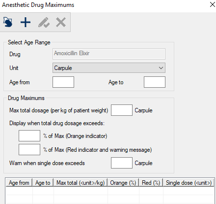 Anesthetic Drug Maximums Window(Maintenance > Case Management > Anesthetic Drugs > Anesthetic Drug Maximums icon) The Anesthetic Drug Maximums window allows you to manage anesthetic drug maximum values. It displays when you open the Anesthetic Drugs window and click the Anesthetic Drug Maximums ( Drug maximums are optional and can be configured to indicate and warn users when drugs are approaching (or have approached) their maximum recommended dosages. These maximums are based on drug/unit combinations, so if a drug can be delivered via different units, the maximums can also be different. Maximums are also based on age ranges.