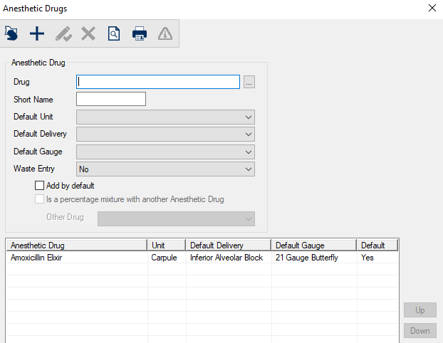 Anesthetic Drugs WindowThe Anesthetic Drugs window allows you to manage the drugs available for use in the Case Management module and to define default behavior.