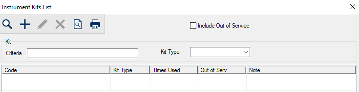 The Instrument Kits List window allows you to search for and manage kits used in the Dispensary module.