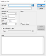 The Instrument Kits window allows you to specify kit information. It displays when you open the Instrument Kit List window and click the Add a new Record ( ) icon or select a listed kit and click the Edit Record ( ) icon.