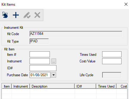 The Kit Items window allows you to create and manage the instruments included in a specific kit. It displays when you open the Instrument Kits window and click the Details button.