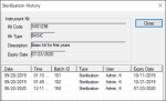 The Sterilization History window allows you to view historical sterilization information. It displays when you open the Instrument Kits window and click the Sterilizations... button.