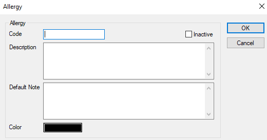 Allergy Window(Maintenance > EHR > Allergy List) The Allergy window allows you to specify an allergy and the relevant information about it. It displays when you open the Allergy List window and click the Add a new Record (