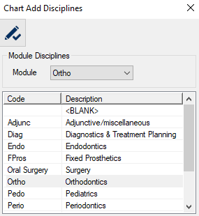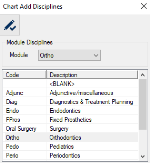 Chart Add Disciplines WindowThe Chart Add Discipline window allows you to specify the default discipline to use in the Perio and Ortho modules when adding treatment.