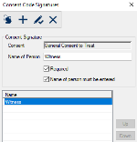 The Consent Code Signatures window allows you to specify the non-patient signatures required for the selected consent code.
