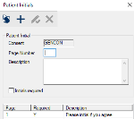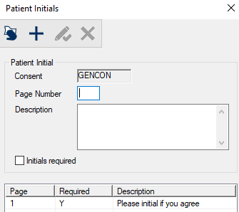 The Patient Initials window allows you to specify any pages of the consent that should capture the patients initials, and whether those initials are required. It displays when you open the Consent Codes window, select a listed consent code and click the Patient Initials... button.
