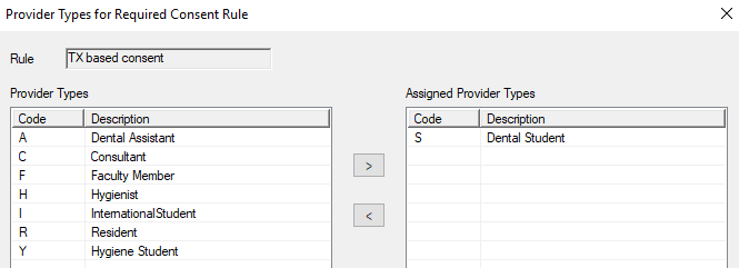 Provider Types for Required Consent Rule Window(Maintenance > EHR > Required Consent Rules) The Provider Types for Required Consent Rule window allows you to specify the provider types that the selected rule applies to. It displays when you open the Required Consent Rules window, select a listed rule and click the Provider Types... button.  Provider Types for Required Consent Rule - Tasks
