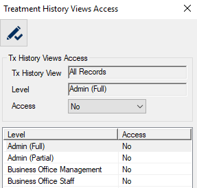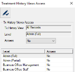 Treatment History Views Access Window(Maintenance > EHR > Treatment History Views > Level Access icon) The Treatment History Views Access window allows you to manage access to the selected treatment view. It displays when you open the Treatment History Views window, select a listed module and view, then click the Level Access ( ![]()
