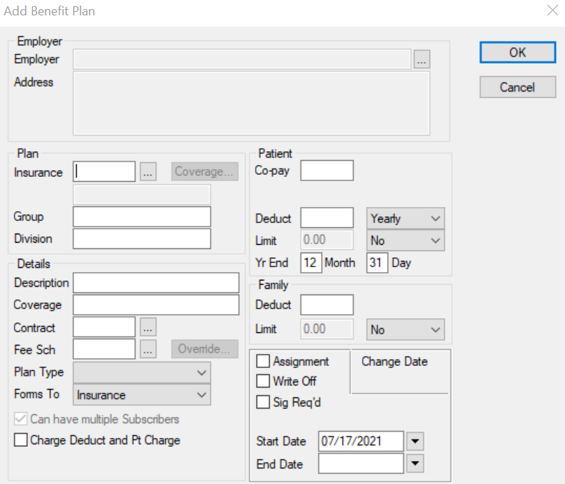 The Add Benefit Plan window allows you to enter information about a benefit plan. It displays when you open the Benefit Plan List window and click the Add a new Record ( ) icon.