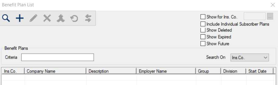 The Benefit Plan List window allows you to search for and manage the list of benefit plans for use by patients at your institution.