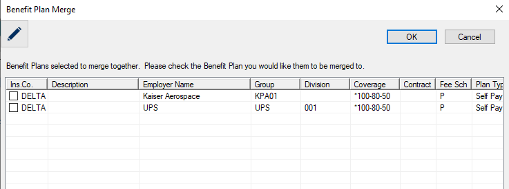 The Benefit Plan Merge window allows you to review and merge benefit plans. It displays when you open the Benefit Plan List window, select multiple listed plans and click the Merge Benefit Plans ( ) icon.