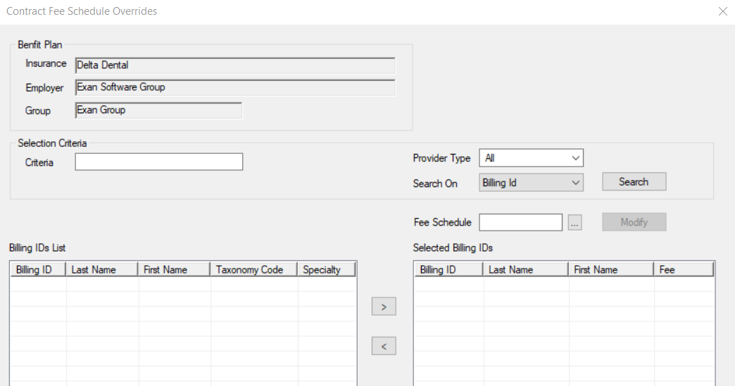 The Contract Fee Schedule Overrides window allows you to override the contract's fee schedule for specified providers for the selected contract policy. It displays when you open the Edit Benefit Plan window and click the Override... button next to the Fee Sch field.