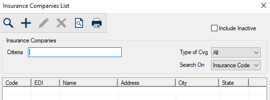The Insurance Companies List window allows you to search for and manage the list of Insurance Companies for use by patients at your institution.