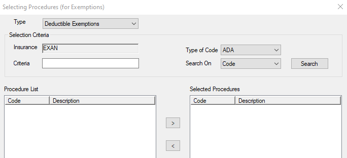 The Selecting Procedures (requiring ICD codes) window allows you to specify procedures that require medical diagnosis information on dental claim forms.