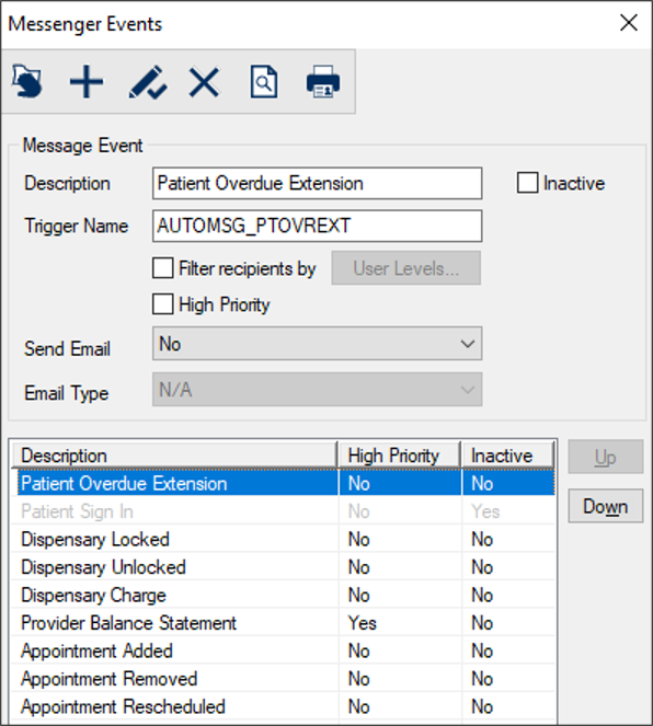 Messenger Events WindowYou can configure axiUm to send messages automatically to users and/or groups when a messenger event occurs. Examples: Patient is checked in, an appointment is failed, etc. These events require a custom Oracle trigger that controls when the message is sent, who it is sent to, and what the message says. The Messenger Events window allows you to manage the messenger events for your institution. For more information on creating the Oracle trigger for messenger events, refer to the Desktop Setup Guide.  Messenger Events - Field Definitions