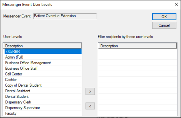 Messenger Event User Levels Window(Maintenance > Office > Messenger Events) The Messenger Event User Level window allows you to filter the recipients of an auto-message based on their security level. When defined, only users assigned to the specified security level will receive the message. It displays when you open the Messenger Events window, select a listed event and click the User Levels... button.  Messenger Event User Levels - Field Definitions