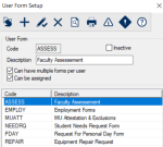 User Form Setup WindowUser forms are created when you want to record detailed information about a user/provider that is not already recorded in the Users window. Examples: Additional demographics, credential details, a provider satisfaction survey, or a quality assurance form. Once the user form is created, working with user form pages and status codes is the same as working with regular EPR forms. For more information, see Form Setup. ![]()