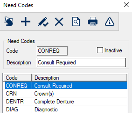 Need Codes WindowNeed codes are based on general types of treatment. Patients can be assigned need codes which identify the type of work they need to have done. Providers can make a needs request which will assign them to a patient that requires the same treatment that the provider needs to complete. The Need Codes window allows you to manage the list of need codes. ![]()