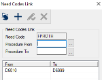 Need Codes Link Window(Maintenance > Patient > Need Codes) The Need Codes Link window allows you to assign ranges of procedures that may be required to resolve the need code. It displays when you open the Need Codes window, select a listed need code and click the Need Codes Link ( ![]()