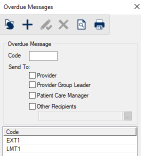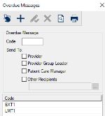 A text field that indicates the overdue message code to use when the condition becomes overdue, and determines which user(s) should receive the message.