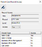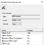 The Patient Care Record Access window allows you to manage access to individual record types within a view. It displays when you open the Patient Care View Records window, select a listed record and click the Level Access ( ) icon.