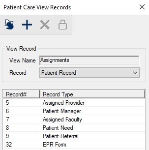 The Patient Care View Records window allows you to assign the records to include in the patient care view. It displays when you open the Patient Care Views window, select a listed view and click the Patient Care View Records ( ) icon.