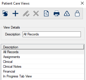 Note: The All Records view is hard-coded into axiUm and displays in the Patient Care module and all new created views default to the All Records view’s access specifications.