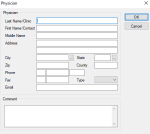Physician Window(Maintenance > Patient > Physician List) The Physician window allows you to enter information about a physician or a clinic. It displays when you open the Physician List window and click the Add a new Record (