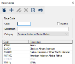 Race Codes WindowThe Race Codes window allows you to manage codes that indicate the race(s) that a patient identifies as.