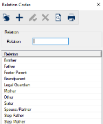 Relation Codes WindowThe Relation Codes window allows you to manage relation codes which are used to identify the relationship between a patient and their guarantor, or emergency contact.